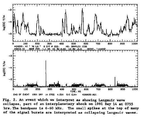 Другое экспериментальное подтверждение коллапса было получено со спутников, потому что это явление типично для солнечного ветра и для междупланетной плазмы. Например, в 1997 году спутник Улисс летал на довольно большом расстоянии от Земли и измерял электрическое поле, идущее от солнца. Продольного поля в направлении света вообще не должно быть: волны, как известно, поперечны. В плазме, однако же, бывают продольные волны. Они сконцентрированы в виде отдельных выбросов. Размер большой штуки около 100 метров. Размер каверны у Круглякова равен 2 миллиметрам, а здесь 100 метров — это, конечно, космические масштабы. Удивляться такому не приходится. Коллапс ленгмюровских волн, такая самопроизвольная концентрация волновой энергии в очень малых объемах (как мы видим, здесь логарифмический масштаб, и я обращаю на это внимание) означает, что поле приблизительно в 100 раз больше, а энергия — квадрат поля — в 10000 раз больше, чем в окружающей среде. Это, конечно, экстремальная волна, что показывает, что явление экстремальных волн достаточно универсально и многообразно.