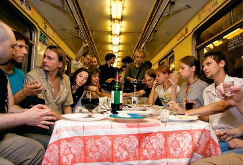 Поминки по поэту Дмитрию Александровичу Пригову группа «Война» устроила прямо в вагоне метро и приглашала к столу всех входящих пассажиров