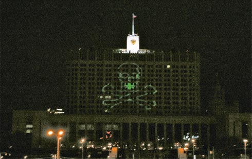 Череп и кости на здании Белого дома в Москве нарисовали с помощью лазера