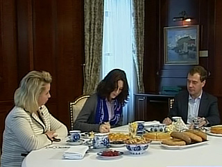 После чаепития Медведев и его супруга ответили на вопросы анкеты. Президент рассказал, что с ним постоянно проживают два человека - его супруга и сын Илья, 15 лет, уточнил дату и место рождения, семейное положение, национальность, гражданство и образование и т.д. На прощание он подарил Федоровой ручку, чтобы у нее всегда было с собой орудие производства.