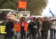 Около 200 сотрудников академических институтов из разных городов приняли участие в митинге протеста ученых на набережной Тараса Шевченко в Москве, сообщает корреспондент Граней.Ру. Участники акции потребовали увеличения финансирования науки, а также повышения стипендии аспирантам с 1500 до 8500 рублей. Кроме того, митингующие ждут от властей решения вопроса о строительстве квартир для работников Российской академии наук. Кроме ученых, в митинге приняли участие представители нескольких политических партий, в том числе КПРФ, "Яблоко", "Правого дела" и ЛДПР.