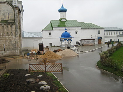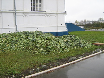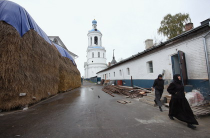При входе в Свято-Боголюбский монастырь сразу поражаешься размаху хозяйственной деятельности, которая там идет. Возле собора гора капустных листьев — видно, закладывали на зиму капусту. Посреди двора две огромные, величиной с хороший деревенский дом, скирды сена: «От прошлого года осталось, так сказать, стратегический запас», — усмехается сопровождающая журналистов мать Антония. Кругом свалены бревна, часть уже расколота на дрова и сложена под тентами — размером с парники в каком-нибудь овощном хозяйстве. Там-сям высятся горы песка и груды кирпичей. Вдоль забора череда дверей под номерами. «Это что?» — спрашиваю. — «Гаражи», — отвечает одна из послушниц. По всему видно, что монастырь стоит крепко и на жизнь не жалуется. Вот только на него жалуются.