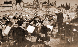 | | | --- | | | | Симфонический оркестр под управлением М. И. Ривкина в Москве на съемках передачи на ЦТ. За роялем А. М. Чиркова. 1966 год. |