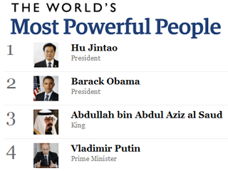 Самым могущественным в мире издание признало Ху Цзиньтао, поскольку он управляет пятой частью населения планеты (1,3 миллиарда человек) и второй после США экономикой мира. За ним следует президент США Барак Обама, а на третьем месте в рейтинге Forbes - король Саудовской Аравии Абдалла бин Абдель Азиз, пишет РИА "Новости".