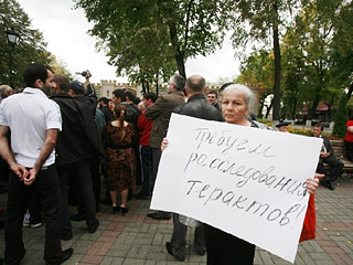 Лидер движения "Голос Беслана" Элла Кесаева в громкоговоритель призывает всех прохожих присоединиться к пикету. "Присоединитесь к нам, поддержите нас. Мы также были раньше безучастны и беспечны, пока нас не коснулся этот теракт. Мы требуем, чтобы расследовали бесланский теракт и все остальные, которые из года в год происходят в республике. Мы хотим знать, какие сотрудники правоохранительных органов понесли наказание за то, что пропускают в республику машины с оружием и взрывчаткой", - сказала она.