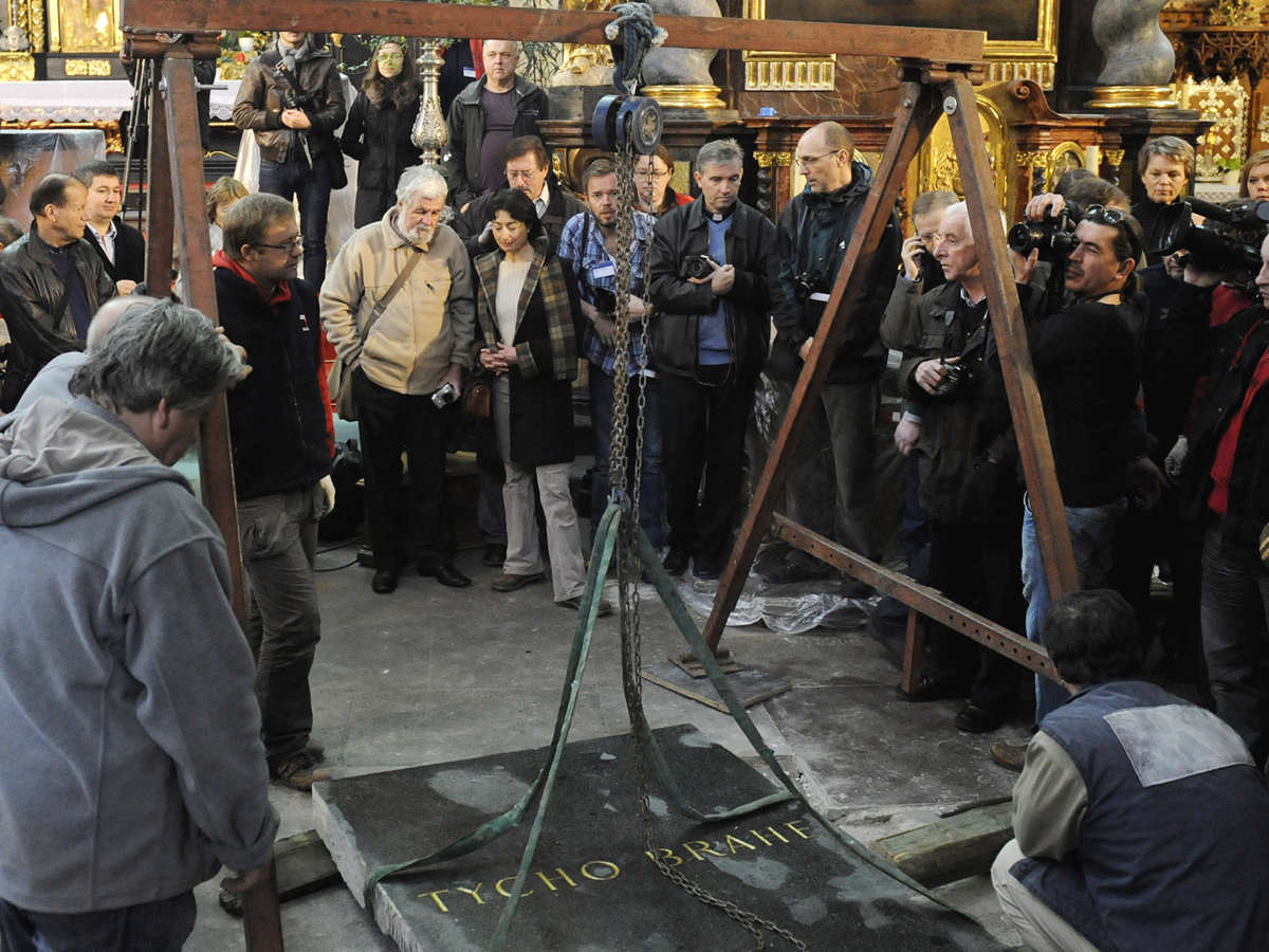 Из подземной гробницы Тынского храма на Староместской площади, накрытой гранитной плитой с именем Тихо Браге, извлекли оловянный гроб с останками ученого. Специалисты из Дании, Швеции и Чехии откроют гроб в антропологической лаборатории Национального музея и проведут исследование. Останки знаменитого астронома снова вернутся в гробницу храма в пятницу, 19