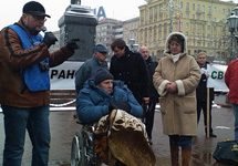На митинг приехал главный редактор газеты "Химкинская правда" Михаил Бекетов, искалеченный неизвестными два года назад. Как передает Каспаров.Ру, на мероприятии выступили адвокаты Бекетова Сталина Гуревич и Андрей Столбунов. Сам Бекетов жестами высказывал свое согласие с речью выступавших.