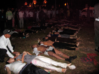 Больницы Пномпеня переполнены ранеными, морги - телами погибших. Телевидение показывает тела жертв трагедии и лица убитых горем родственников.
