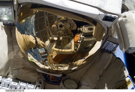 Фёдор Юрчихин фотографирует Олега Скрипочку во время выхода в открытый космос. Фото НАСА