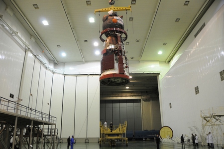 В монтажно-испытательном корпусе космических аппаратов (МИК КА) филиала "Байконур" Ракетно-космической корпорации "Энергия" имени С.П. Королёва продолжаются работы по подготовке к запуску пилотируемого космического корабля "Союз ТМА-20".