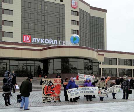 Лозунги на плакатах пикетчиков были, в частности, такие: "В реках яд и в детях яд - испоганил нефтью, гад!", "ЛУКойл - ты убийца наших детей!", "Жить в ЛУКойловском дерьме - это хуже, чем в тюрьме!". Была на одном из плакатов и такая надпись: "Свастики разные на вид, подлое дело одно - геноцид!". А к ней иллюстрация: трубы с капающей из них нефтью составляют свастику, которая почти полностью закрыта эмблемой "ЛУКойла".