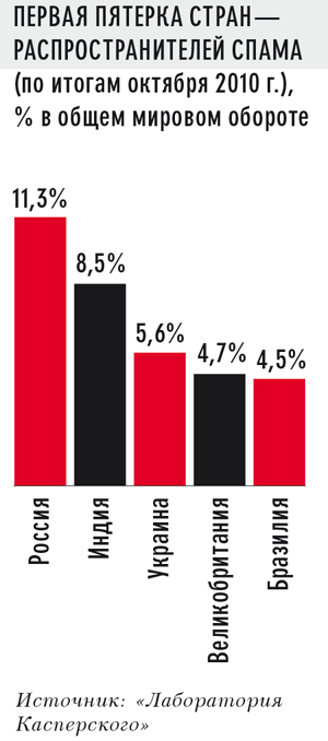 Спам-стахановцы Согласно рейтингу «Лаборатории Касперского», в октябре 2010 года Россия стала лидером в рейтинге стран-источников спама, потеснив с первых мест Индию и Америку. «Причина в том, что в России никто не борется со спамом, как и с любыми другими видами компьютерной преступности, — объясняет