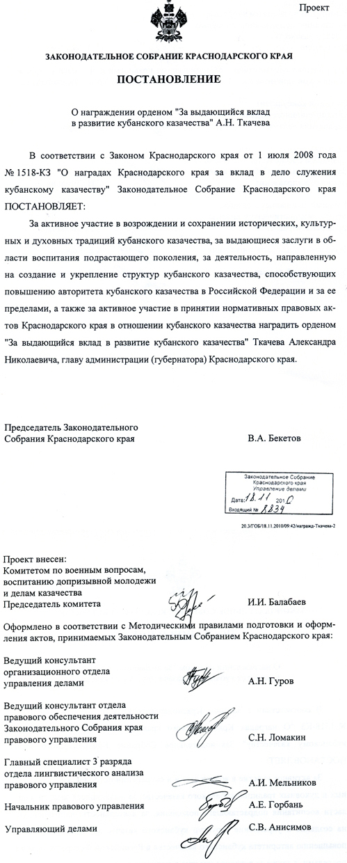 В распоряжении редакции оказался любопытный документ — постановление заксобрания Краснодарского края «О награждении орденом "За выдающийся вклад в развитие кубанского казачества" губернатора Александра Ткачева. Обратите внимание на дату, когда документ был внесен на рассмотрение: 18 ноября. В это время в Кущевской уже вовсю работали следователи. По нашей информации, рассмотрение Постановления... пока отложено. Но номинанта, наверное, уже можно поздравить?