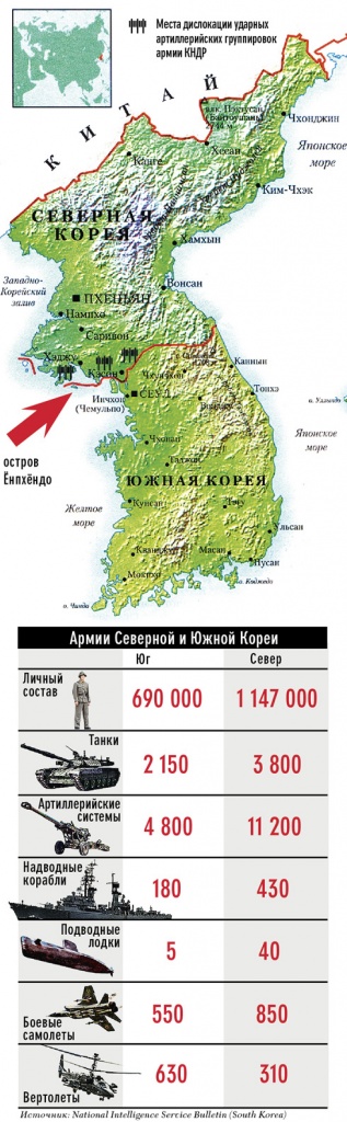 Остров Ёнпхён находится на спорном участке межкорейской морской границы в Жёлтом море, которую отказывается признавать Пхеньян. 57-летняя Че Ок Сун живет на острове уже 30 лет. 23 ноября Сун и ее соседей военные предупредили: на северокорейском берегу замечено передвижение войск, мол, могут быть неожиданности. «Но мы не ожидали, что снаряды будут падать прямо на жилые кварталы, шесть домов под горой полностью сгорели, — рассказала Сун в телефонном интервью The New Times. — Взрывы длились больше часа, с небольшим перерывом. Мы чувствовали себя, как на линии фронта, многие решили, что началась война. Люди выбегали из своих домов и неслись куда глаза глядят». Всего на Ёнпхён упало более ста северокорейских снарядов. Стреляли предположительно с северокорейского местечка Гемори, находящегося на побережье в 12 км от Ёнпхёндо. Одна из южнокорейских телекомпаний запустила слух, что Север начал войну «в связи с кончиной Ким Чен Ира», но через час сама же его опровергла. Тогда в связи с чем?