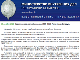 "Правоохранительные органы всегда действуют с опорой на граждан. Вместе с белорусским народом и президентом страны мы готовы достойно завершить выборы, сохранить мир и спокойствие в обществе, уверенно войти в новый 2011 год и строить независимую, сильную и процветающую Белоруссию", - отмечается в заявлении.