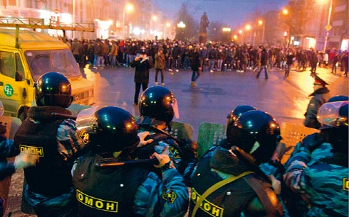 Власть слушает Около 17 часов, когда уже стало смеркаться, словно по чьей-то команде толпа выстроилась в колонну и двинулась в центр. Метров через 50 дорогу маршу преградил ОМОН. Противостояние длилось минуты три — омоновцы разомкнули строй, пропуская толпу. У входа в Драматический театр им. Горького собралось около 700 человек. Их окружали несколько милицейских кордонов. «Театральная площадь — это финиш, — говорит футбольный фанат Роман. — Отсюда либо уже уходи, либо митингуй, выдвигай требования. Мы выбрали второе». Трибуной стал милицейский уазик.