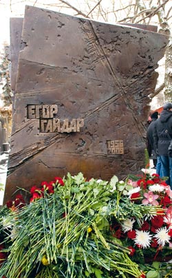Под этим монументом на Новодевичьем кладбище в Москве лежит Егор Гайдар. Последний гений либеральной эпохи, которая умерла еще до его смерти. Этот памятник был поставлен, как и положено, в годовщину его ухода — 16 декабря. На открытие пришли друзья Гайдара — Анатолий Чубайс, Яков Уринсон, пришли мама, дети, вдова, друзья, один вице-премьер (Александр Жуков), один министр (Эльвира Набиуллина) и один бывший министр, а ныне банкир (Герман Греф). И казалось, что памятник — книга с разлетающимися на ветру страницами — это как водораздел между двумя мирами: в одном — реформы и либеральные идеи, в другом — чекисты и огосударствление экономики. Галич когда-то написал поминальную молитву о Януше Корчаке, польском враче, который пошел в газовую камеру вместе с детьми своего детского дома: «Пан Корчак! Не возвращайтесь! Вам страшно будет в этой Варшаве! Вам стыдно будет в этой Варшаве!»