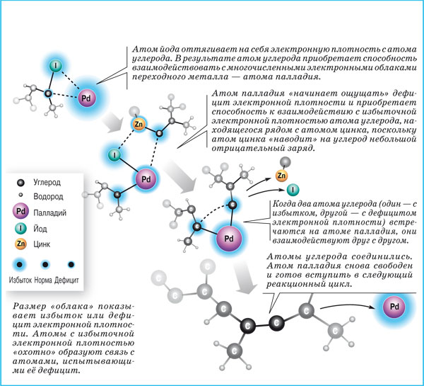 До начала «эры палладия», которую открыли работы нынешних лауреатов, химикам-органикам приходилось синтезировать сложные молекулы из блоков в несколько стадий. За счёт высокой активности реагентов в реакциях образовывалось такое количество побочных соединений, что выход конечного продукта оказывался мизерным. Использование палладия стало очень удачным выходом из положения. Он оказался идеальным «местом встречи» атомов углерода. На атоме палладия два атома углерода располагаются так близко друг к другу, что между ними может начаться взаимодействие. Реакция на палладии протекает с высоким выходом нужного продукта без нежелательных побочных процессов.