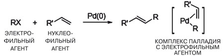 Нобелевские лауреаты нынешнего года разработали методики для двух типов реакций с участием палладия. В обеих реакциях взаимодействуют два реагента — электрофильный (с дефицитом электронной плотности) и нуклеофильный (с избытком электронной плотности). В качестве электрофильного агента всегда выступает молекула углеводорода (R), в котором концевой атом водорода замещён на атом галогена (Х=хлор, бром, иод). А вот нуклеофильные агенты различаются — в одном случае (схема 1) используется молекула олефина (линейного углеводорода с одной двойной связью), а в другом (схема 2) — металлоорганическое соединение (М=цинк, бор или олово). Сначала образуется комплекс атома палладия с электрофильным агентом, а затем этот комплекс взаимодействует с нуклеофильным соединением.