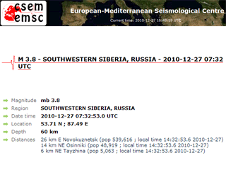 В то же время на сайте Европейско-Средиземноморского сейсмологического Центра сообщается, что в указанном районе зафиксировано землетрясении магнитудой 3,8 балла, эпицентр которого находится на 26 км восточнее Новокузнецка и на 14 км северо-восточнее Осинников.