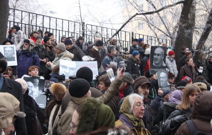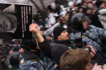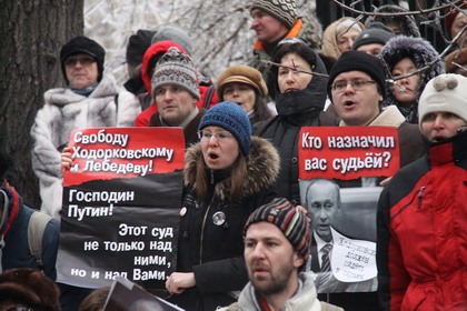 Кто оставался вне правил и условностей, так это – улица. Сотни людей пришли в понедельник к зданию суда, чтобы напомнить судейским о таком экзотическом для них понятии, как справедливость. Поначалу люди стояли молча по обе стороны узкой улицы и на пригорке напротив здания суда. Политические активисты позвали всех на акцию «Ожидание справедливости», и все стояли, ожидая этой справедливости от Хамовнического суда. Но разве дождешься справедливости в России? Разве не знаем мы, что покорное ожидание справедливости – дело пустое и безнадежное? Поэтому когда кто-то крикнул «Свободу!», сотни людей подхватили это слово и скандировали не переставая. Вскоре абстрактное требование свободы сменилось более конкретными лозунгами: «Свободу политзаключенным!», «Россия без Путина!», «Раз, два, три, Путин уходи!». Тут же какой-то остряк предложил кричать «Три, два, раз, Путин…», и остряк замолчал. Публика, вдоволь повеселившись, скандировать эту речевку не стала, заменив ее на «Путин – лыжи – Магадан».
