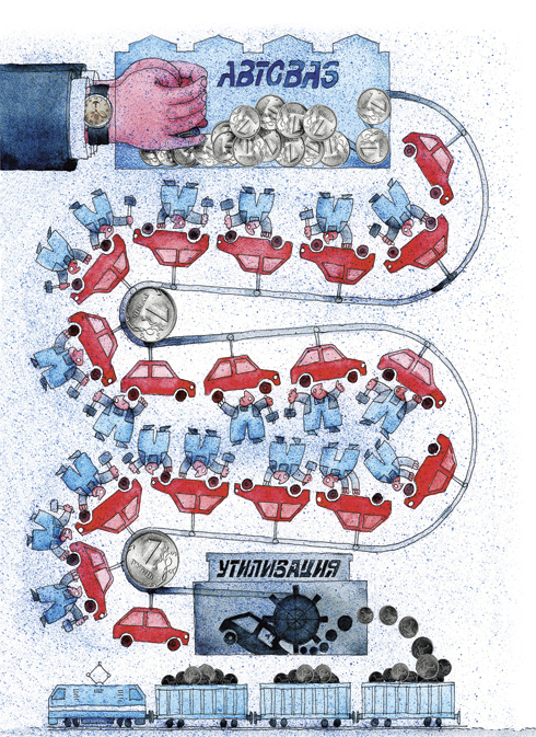 В 2010 году тольяттинский автозавод презентовал программу развития сроком на 10 лет и стоимостью 183 млрд рублей. Однако прежде чем запустить эту программу, АвтоВАЗ получил солидную помощь из бюджета — 65 млрд рублей на реструктуризацию долгов. Но главную поддержку государство оказало предприятию не деньгами из казны, а принятием программы утилизации старых автомобилей. Половина из без малого 600 тыс. авто, которые реализовал завод в 2010 году, были проданы именно по программе утилизации. Государство позаботилось о том, чтобы АвтоВАЗу было куда сбывать машины, собранные на бюджетные деньги.