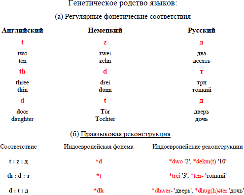 В принципе, сравнительно-историческое языкознание хорошо знает, как обосновывать родство языков с помощью установления между ними регулярных фонетических соответствий как вот здесь, если видно, - на примере нескольких соответствий между близкородственными друг другу английским и немецким языком и чуть дальше родственным с ними русским языком. Определяются звуковые законы, по которым изменялись слова от праязыка к языкам-потомкам. Один и тот же звук, одна и та же фонема, в каком бы слове она ни встречалась, должна в другом языке соответствовать точно определенной фонеме. Например, английское «t» всегда соответствует немецкому «z» и русскому «д» - это в очень грубых терминах.