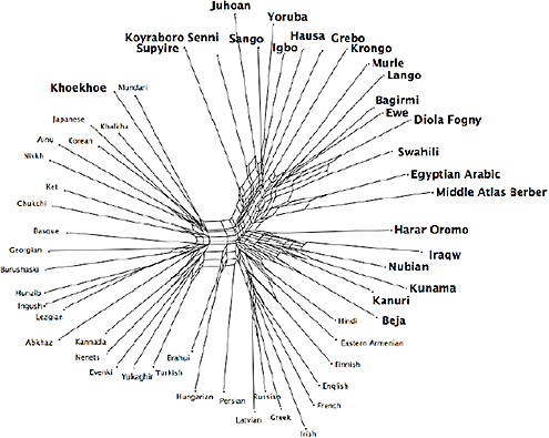 Поскольку языковые изменения давно сравниваются с биологическими, то можно развивать эту аналогию - сравнивать типологические признаки, например, с разными биологическими признаками, на основании которых можно строить так же, как и в биологии, классификации. Самое простое, грубое решение вопроса возможно такое: языки, у которых много признаков совпадают между собой, мы будем считать близкими родственниками, на этом основании классифицировать их по группам, потом - по семьям и так далее. Все эти типологические базы компьютеризированы, информация обрабатывается в них автоматически, и в результате, просчитав, обследовав большое количество признаков, можно на этом основании построить разные типологические деревья, точнее, обычно строят не деревья, а сети networks – это графы более сложной структуры без единой вершины, которые позволяют наглядно определить позицию одного элемента относительно всех остальных. Вот пример такой сети, построенной как раз по нескольким языкам Евразии и Африки на материале мирового атласа языковых структур.