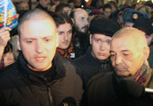 В пятницу возле здания специзолятора ГУВД были задержаны активисты движения "Солидарность" Анастасия Рыбаченко и Тивур Шагинуров. Их заподозрили в том, что они растянули на стене дома напротив изолятора баннер размером 6 на 8 метров с надписью "Свободу героям" с портретами Немцова и Лимонова.