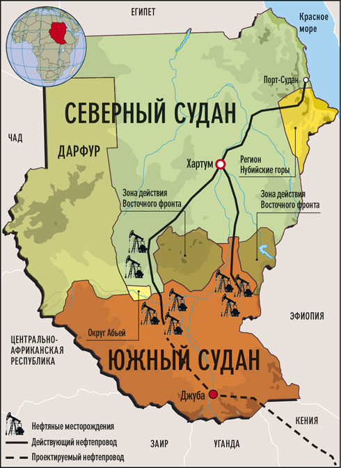 75–80% суданской нефти добывается на Юге. Сейчас ежедневный объем нефтедобычи — 550–600 тыс. баррелей, из которых примерно 360–370 тыс. идет на экспорт. Однако почти все нефтехранилища и НПЗ — на Севере. Да и единственный нефтепровод длиной 1,5 тыс. км идет с месторождений в южносуданской провинции Юнити далеко на Север — прямиком в Порт-Судан на Красном море. В случае конфликта северяне его перекроют на раз: южане могут хоть упиться своей нефтью. И сейчас для режима Омара аль-Башира в Хартуме нефтепровод — почти половина всех доходов бюджета, а впредь можно будет «стричь купоны» за транзит. Это куда дальновиднее, чем затевать новый конфликт. «У Севера и Юга, по крайней мере в ближайшие три года, нет альтернативы экономическому сотрудничеству, — делает вывод в разговоре с The New Times эксперт по Судану из парижского университета «Сьянс-По» Ролан Марешаль. Почему именно три года? Столько потребуется для строительства нового трубопровода — через территорию Кении к Индийскому океану, который по заказу южносуданского президента Сальва Киира начинают строить китайские специалисты. Кстати, именно Китайской национальной нефтяной компании принадлежит 60% в консорциуме по эксплуатации северного трубопровода: едва с суданских нефтяных полей ушли американцы, их место тут же заняли китайцы, частично — канадцы и японцы. „