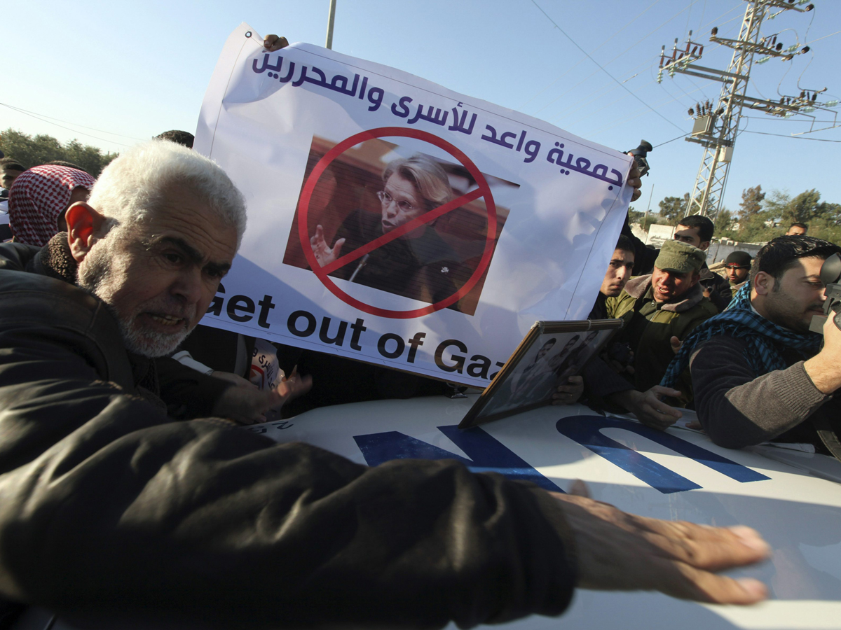 Собравшиеся у пограничного пункта Эрец, протестующие палестинцы запрыгивали на машину министра, ложились у нее на пути.
