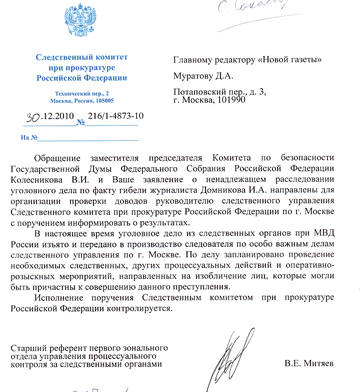 В конце декабря 2010 года «Новая газета» получила официальное подтверждение из следственных органов и прокуратуры: уголовное дело в отношении предполагаемых заказчиков убийства нашего журналиста Игоря Домникова вновь открыто.