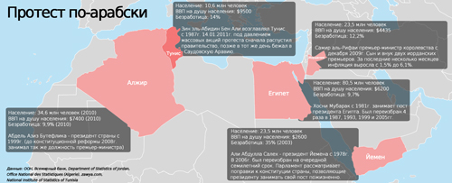 Попытки переворота, "дни гнева", демонстрации охватили страны арабского мира после "жасминовой революции" в Тунисе. Жители Алжира, Йемена, Иордании, Египта, вдохновленные успехом братьев-мусульман, вышли на улицы своих городов с требованием смены действующих режимов.