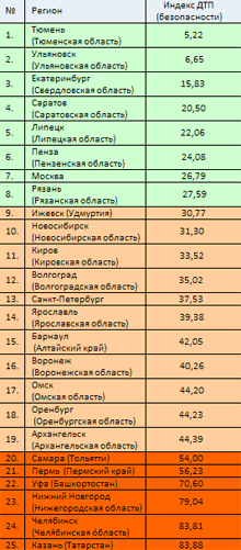Лидерами рейтинга признаны Казань, Челябинск, Нижний Новгород, Уфа, Пермь, Самара. В Казани, как отмечают авторы исследования, количество ДТП из-за плохих дорог составляет 83,88% от общего числа.