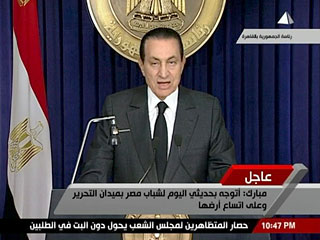 Президент Египта Хосни Мубарак не оправдал надежд оппозиции. Он выступил с телеобращением к нации, в котором, вопреки ожиданиям, не заявил об уходе в отставку. Напротив, он поклялся Богом, что не уйдет с поста до следующих выборов главы государства. При этом он приступил к работе с конституционными поправками (цитата по "Интерфакс"). Вместе с тем он передаст власть вице-президенту Омару Сулейману в соответствии с Конституцией.