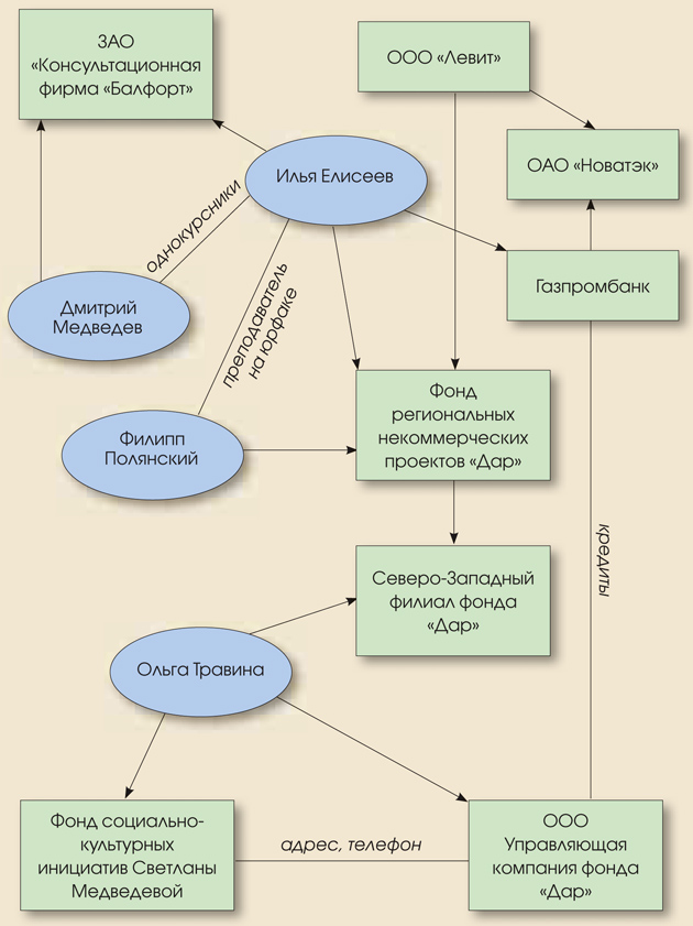 В фонде «Дар» собралась любопытная компания бывших выпускников юрфака Ленинградского университета. Помимо Елисеева, возглавлявшего наблюдательный совет, генеральным директором фонда с 2006 по 2008 год был Филипп Полянский. Как сообщала бизнес-газета «Ведомости», Елисеев был преподавателем Полянского на юрфаке. Впервые имя Полянского попало в поле зрения СМИ в 2009 году, когда принадлежащая ему компания «Цертум-Инвест» приобрела дворец графа Кушелева-Безбородко за 740 млн рублей. Независимые наблюдатели тогда удивлялись, откуда у малоизвестной компании могли взяться такие деньги на покупку дворца, в связи с чем выдвигались предположения, что сделка могла осуществиться в интересах «Новатэка», «Газпрома» или Газпромбанка. Однако во всех компаниях эту информацию опровергли. Любопытно, что до революции последним владельцем дворца графа Кушелева-Безбородко был известный в Петербурге меценат и банкир Александр Григорьевич Елисеев. «Новая газета» предположила, не мог ли наш современник банкир Илья Елисеев быть родственником последнего владельца дворца, но, к сожалению, зампред правления Газпромбанка Илья Елисеев не ответил на наш запрос.