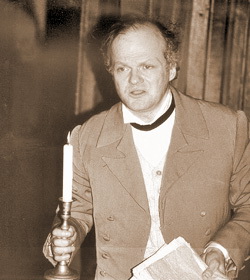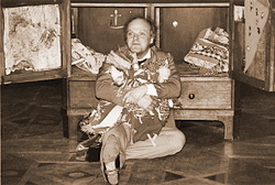 Спектакль заслуженного артиста России Сергея Барковского ждали. Псков помнит его Булгарина-Флюгарина, который был на фестивальной сцене два года назад. И ожидания оправдались. Птицу-тройку гоголевскую он декламирует, сам, как птица, взлетая по скрытой лесенке за шкафом. За ним же, точнее уже над ним, как за кафедрой, он утвердится для горячего монолога о судьбах родины. И снова – получите, кому не лень, – цитата гоголевская о театре-кафедре, с которой «много доброго можно сказать миру».