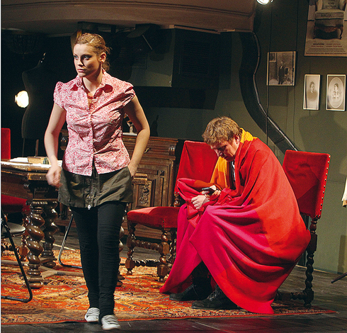 Здесь все правда и неправда одновременно. Как играли до Станиславского — нам покажут подробно и уморительно смешно. Рыцарские доспехи, бледные красавицы с искусственными волосами, обтянутые белыми лосинами ноги, невидящие глаза и фальшивое «умри!» со столь же фальшивым «умираю!». Клюквенный сок, воспетый Блоком в «Балаганчике», здесь станет символом театрального лицемерия и шарлатанства. Нервный Костя будет отчаянно требовать правды — правды жизни, правды веры, правды бытия ценой отказа от правды быта. И тогда в реальной жизни вдохновенный гений превращается в законченного бездушного эгоиста — пока вокруг него будут рушиться судьбы, будут рыдать беременные женщины и нерожденные дети, будет умирать сраженный инсультом отец, будут бушевать войны, громыхать революции, будут гибнуть и калечиться люди. Для великого Константина весь XX век и люди в нем — лишь картонные декорации, бутафория, клюквенный сок. И это та самая драма, о которой он так и не узнает и которая предстанет жестоким фарсом в булгаковском «Театральном романе».