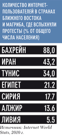 Волна акций протеста накрыла страны Ближнего Востока и Северной Африки. Вслед за революциями в Тунисе и Египте взорвались Алжир, Иран, Бахрейн, Ливия — там власти начали стрелять, и уже погибли как минимум 50 человек. Везде демонстранты координируют свои действия при помощи социальных сетей Facebook и Twitter. Ваиль Гоним, ставший символом египетской революции, написал в своем микроблоге: «Это Революция 2.0: никто не был героем, потому что каждый был героем». The New Times рекомендует