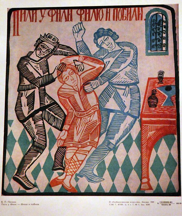 Я с тревогой осмотрелась. Но наркоманов вокруг не было, зато был Виктор Петрович Пензин, директор «Музея народной графики», который привез сюда свою экспозицию. Быстро выяснилось, что он не только чиновник, но и бывший художник: его работы представлены на выставке. Более того, Виктор Петрович нарисовал их в 80—х годах, и все они вышли в 1989 году в каталоге, который он с тех пор мечтает издать заново и поместить в каждой школе.