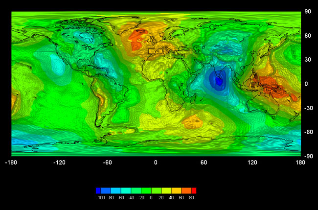 Первая модель гравитационного поля, основанная на данных спутника GOCE. Иллюстрация: ESA – GOCE High Level Processing Facility