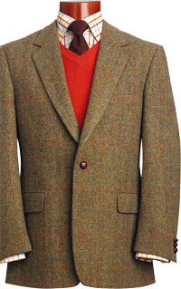 Английский твидовый пиджак обычно застегивается на три, чаще всего кожаные, пуговицы, разрез имеет сзади, карманы выкроены по косой. Считается, что кожаные налокотники делают костюм более стильным.