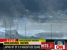 Сильные подземные толчки вызвали мощное цунами, которое двинулось к берегам страны. В ряде районов высота приливной волны превысила десять метров. В нескольких префектурах цунами снесло дома и находившиеся на дорогах машины, а в портовом городе Сендай, который находится в префектуре Мияги, волна высотой десять метров смела целый жилой квартал. Кроме того, затопленным оказался и городской аэропорт. По информации японского телевидения, взлетно-посадочная полоса длиной более трех километров полностью залита водой.