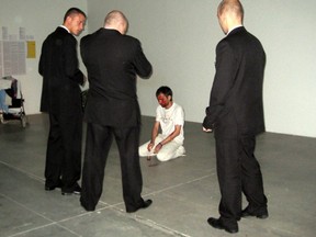 Поэтому я пошел в другое месте, там было слабое освещение, в пространстве выставки «100 лет перформанса», на входе висела табличка – «Не рекомендуется к просмотру до 16 лет». Только дети оказались и там, в углу в качестве инсталляции была насыпана гора конфет, туда подходили дети и брали эти конфеты. Я стоял в том углу и сцеживал кровь себе в стаканчик довольно долго, а над моей головой висела камера видеонаблюдения. Потом сел в центре и стал измазывать лицо кровью и кричать «Вас оскорбляет цвет моей крови?», и кланялся – что-то среднее между мусульманскими и христианскими поклонами. Неприятное зрелище, ощущения тоже. Пришла охрана через какое-то время, но не решалась вмешиваться, потому что не понимала, что происходит. Они переговаривались по рации, стоя рядом со мной. То есть получается, что я как бы в ноги кланяюсь охраннику. Он говорит: «Какой-то сумасшедший на нашей территории что-то вытворяет». Подошло еще два человека, потом еще, в итоге стоят пять или семь человек. Потом они стали выгонять людей из помещения, подошли какие-то медики из «Скорой помощи», которые дежурили рядом, потом милиция. Они стоят, обсуждают. Тут я уже встаю с колен и совершенно адекватно, спокойно с ними разговариваю. «Все нормально», - говорю. «Прокол делал стерильной иглой, да водку выпил, но чтобы кровь не сворачивалась» и так далее.