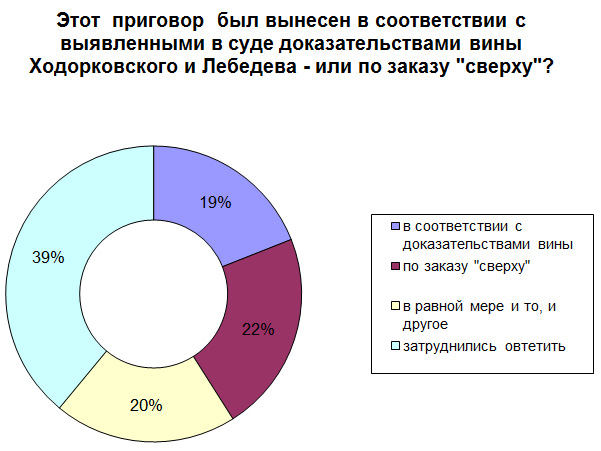 – По поводу второго приговора Ходорковскому и Лебедеву россияне разделились поровну: 28 процентов считают, что суд был справедливым и беспристрастным, и столько же - что он таковым не был. Что, на ваш взгляд, означают эти цифры?
