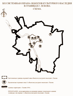 Сегодня по инициативе государственного комитета Псковской области по туризму, инвестициям и пространственному развитию и государственного комитета по культуре охранительная система архитектурного наследия Пскова подвергается не просто пересмотру – запланировано ее полное уничтожение и замена единичными зонами охраны только 11-ти памятников [ 19 ].