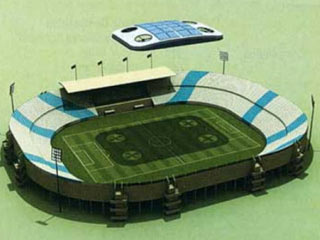 Огромный зонт должен быть изготовлен из сверхлегкой оболочки из углеродного волокна, вмещающей в себя огромное количество гелия. Он будет держаться в воздухе над стадионом за счет четырех моторов, оснащенных солнечными батареями.