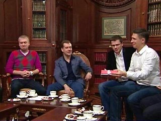 Президент пообещал, что будет брать этот презент с собой в командировки. "Иногда не хочется ничего серьезного смотреть, а ваша продукция всегда приятна", - поблагодарил он. "Можете и нас брать с собой", - не растерялись артисты. Медведев согласился.