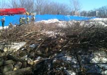 Защитники Химкинского леса остановили вырубку деревьев на правом берегу канала имени Москвы. Как передает корреспондент "Граней", рабочие, нанятые фирмой "Недаркал", планирующей возведение на этом месте комплекса многоэтажных домов, успели вырубить около 10 верб.