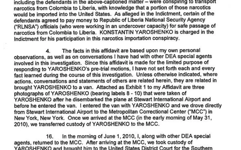 К тому же, продолжают прокуроры, жалобы арестанта «абсолютно безосновательны». По их словам, Ярошенко не был «похищен» в Либерии. «Сотрудники Агентства национальной безопасности Республики Либерия (RLNSA) законно арестовали Ярошенко 28 мая 2010 г., — говорится в меморандуме прокуратуры. — Правительство Либерии впоследствии дало распоряжение о его высылке, и 30 мая 2010 г. сотрудники RLNSA передали его в руки DEA».
